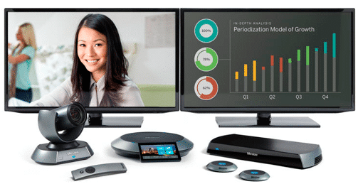 Ein typisches Videokonferenzsystem bestehend aus Kamera, Mikrofonen, Monitoren und Bedieneinheit. (Bild: EMBL)