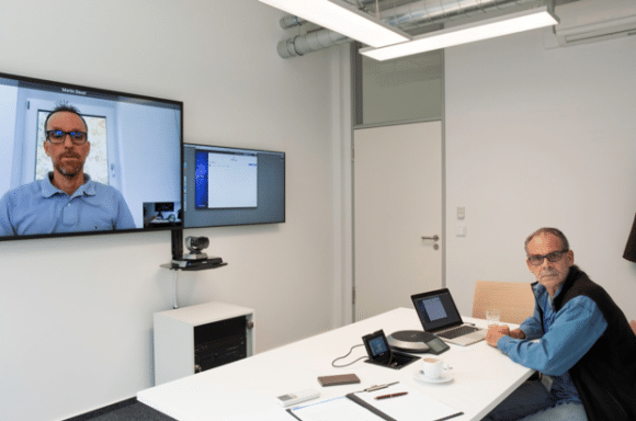 Udo Ringeisen (r) vom EMBL Photolab, bei einer Videokonferenz mit Martin Bauer, Geschäftsführer der Audio Video Network Solution GmbH. (Bild: EMBL)