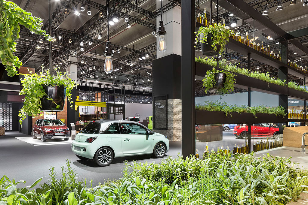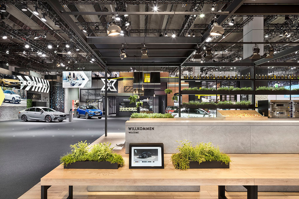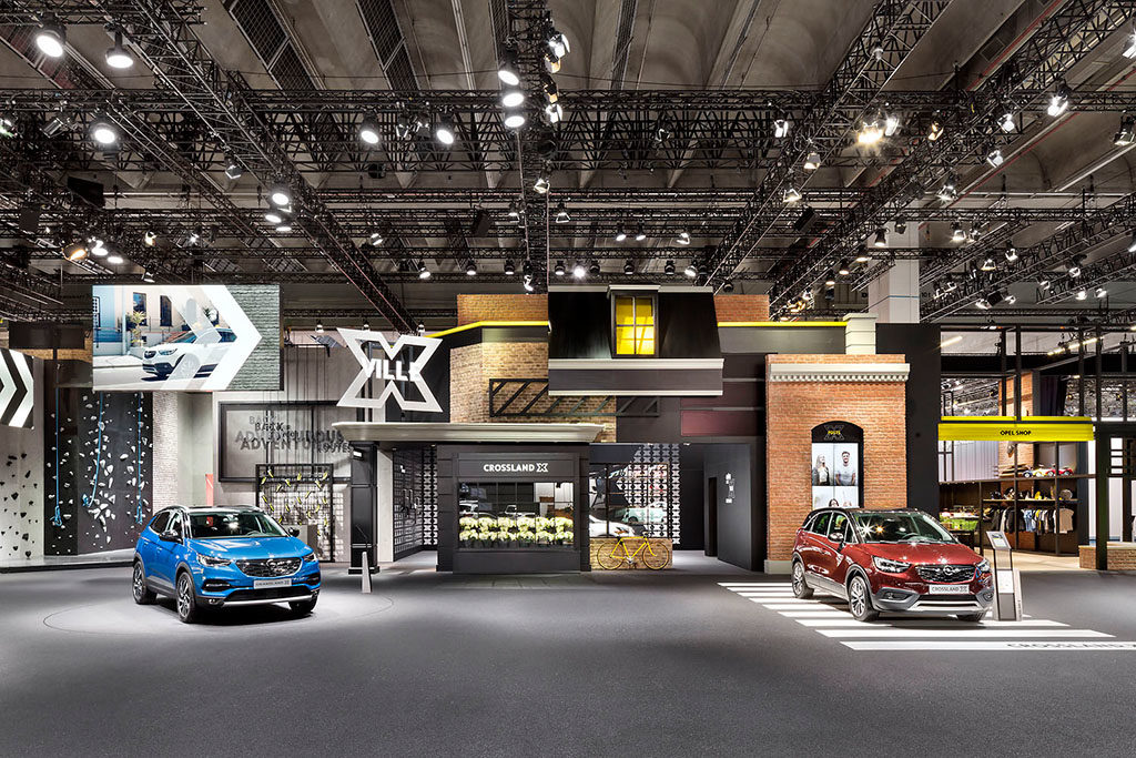 Auf insgesamt 3.300 Quadratmetern realisierten die Experten für räumliche Kommunikation eine collagenartige Stadtkulisse, die moderne Fassadenelemente in Betonoptik mit klassischer Architektur und Vertikal Gardens verbindet. Immer im Mittelpunkt: Die Weltpremiere des neuen Opel SUV „Grandland X“, die im Rahmen der IAA 2017 stattfindet.