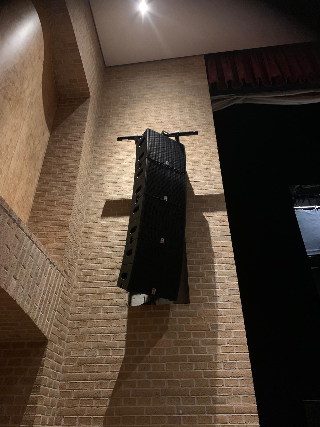 Geschäftsführer Herr Rauchfleisch zu seiner Entscheidung: „In der Planungsphase wurden Raumakustiksimulationen durchgeführt und das beste Ergebnis erzielte das Ikarray-8 Line-Array von Voice-Acoustic. Aufgrund des sehr gleichmäßigen horizontalen 100° Abstrahlverhaltens konnte bei diesem System auf ein Nearfill verzichtet werden. Mit den vertikal eng bündelnden 100°x5° Elementen bekommt man die Schallenergie sehr gut und gleichmäßig auf die hinteren Sitzplätze verteilt. Mit dem untersten 100°x15° Element wird der Nahbereich abgedeckt. Ein Ikarray-8 Element verfügt über vier 1“ Treiber mit einzelnen Waveguids die auf ein bereits gekrümmtes Hornflare münden. Die Krümmung findet bei diesem constant-curved Line-Array bereits innerhalb eines jeden Elementes statt und damit gleichmäßiger als bei herkömmlichen Line-Arrays. Daraus resultiert eine sauberere vertikale Abdeckung mit identischer Klangqualität auf jedem Sitzplatz. Im Bassbereich wird das System von 4x Paveosub-115 ergänzt. Mit einer Bauhöhe von nur 36cm lässt sich dieser 15“ Bass sehr unauffällig in die Architektur integrieren. Der Paveosub spielt tief runter und liefert eine hohe Performance die man von einem so kompakten Bass nicht erwarten würde.“