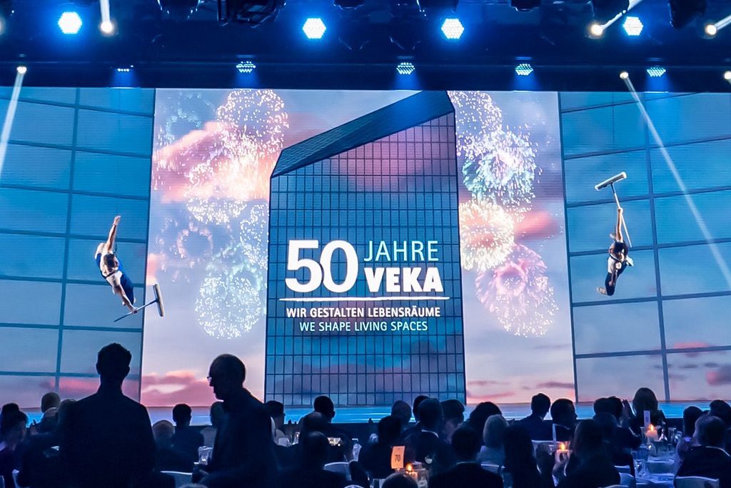 Durch die Story der beiden Gala-Veranstaltungen führten zur Überraschung der Gäste zwei ungewöhnliche Fans der Veka AG, die die Produkte aus nächster Nähe kennen: zwei Fensterputzer, die sich als Vertikal-Akrobaten. Sie lieferten sich im 1. Akt ein Duell auf der LED, die sie kreuz und quer und rauf und runter bespielten. Die Illusion wurde perfekt durch den auf der LED gezeigten Film mit den schwindelerregend hohen Hochhausfassaden der Veka City, zu dem die Fensterputzer synchron agierten. Von Fassade zu Fassade springend wischten sie die elf Meilensteine der Veka-Historie bis zum Jubiläum frei.