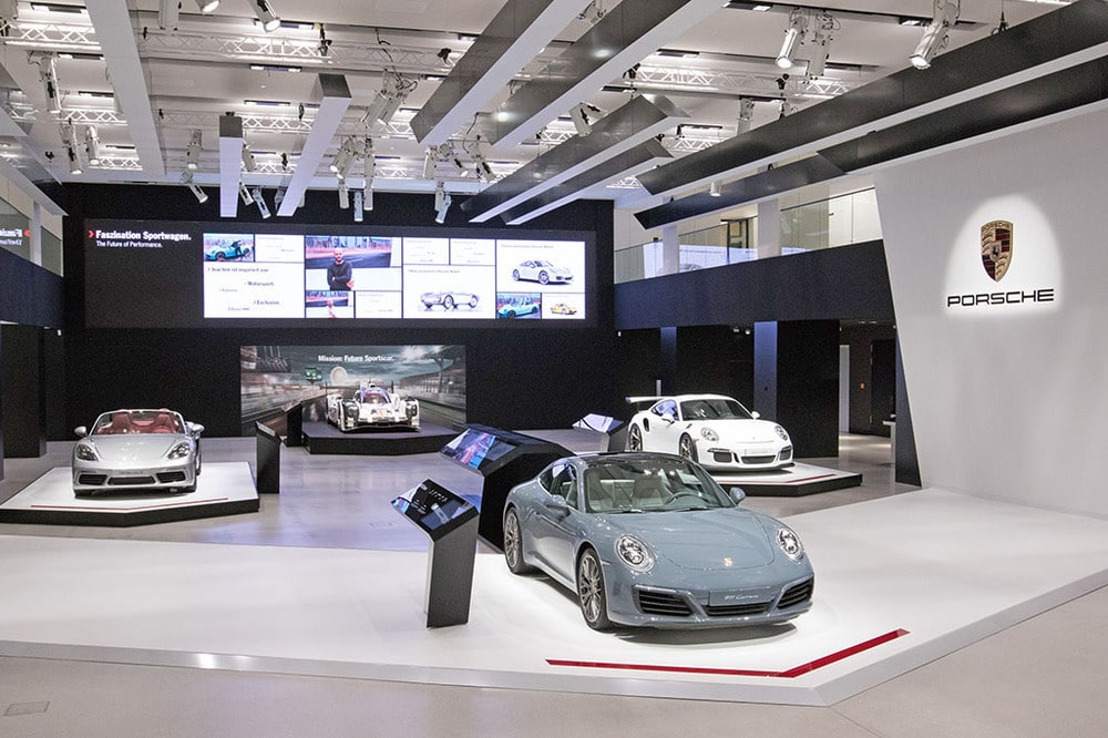 Die Licht-Akzente werden im gesamten Gebäude durch LED-Systeme gesetzt. So kommen beispielsweise bei der vom 16. September bis Ende Oktober dauernden Ausstellung „50 Jahre Motorsport“, sowie bei den wechselnden Präsentationen der Konzernmarken, modernste LED-Scheinwerfer zum Einsatz. Um ebenso die temporären Events ins richtige Licht rücken zu können, bietet die Decke im Hauptraum 21 Technikausschnitte. Hier installierte ASC insgesamt 160 ETC Source Four LED Studio HD Profilscheinwerfer, die an Stromschienen und einem eigens konstruierten Laufwagen frei positionierbar sind.
