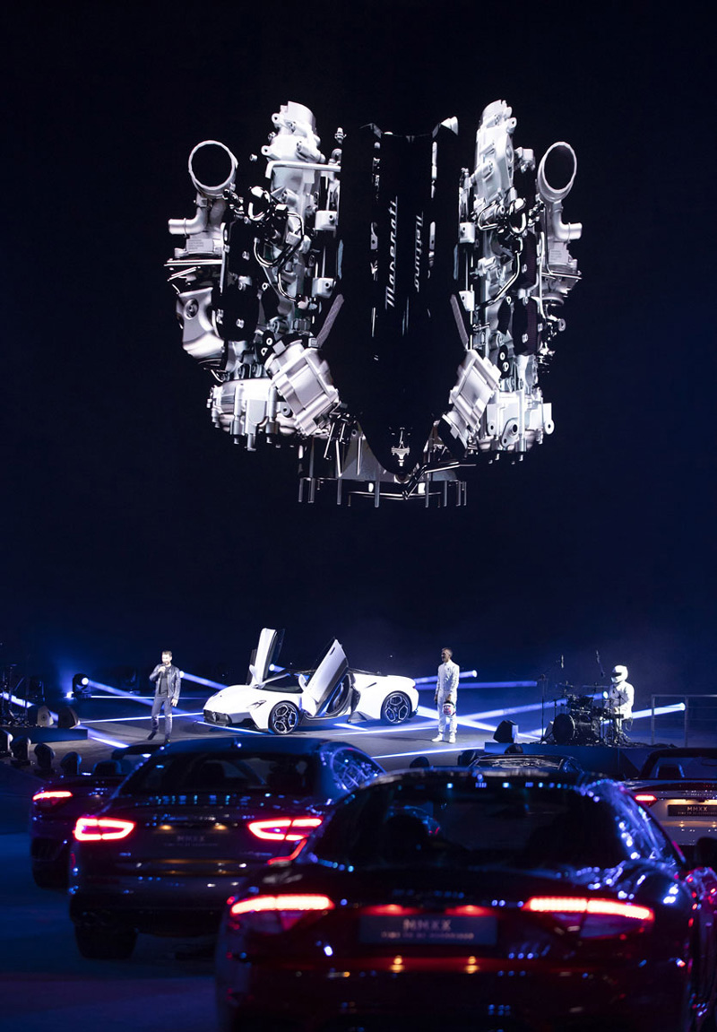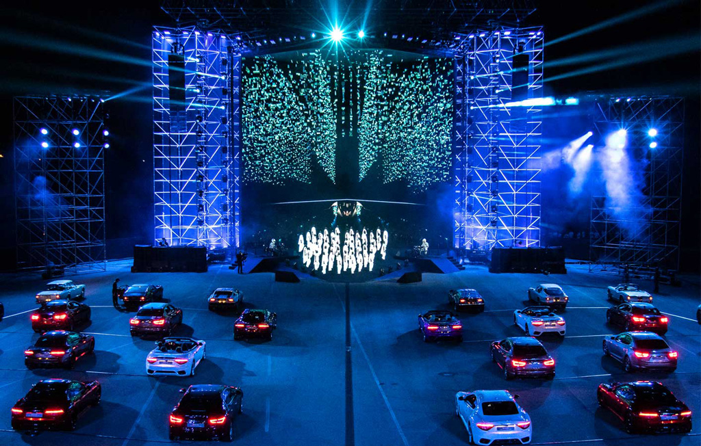 Die visuelle Erzählung wurde durch eine Live-Performance, eine Lichtshow, ein Soundsystem und einen Original-Soundtrack ergänzt. Eine Flotte von 50 Maserati-Fahrzeugen wurde auf der Tribüne ausgestellt und schuf eine eindrucksvolle Drive-In-Theater-Kulisse für über 500 Live-Gäste.
