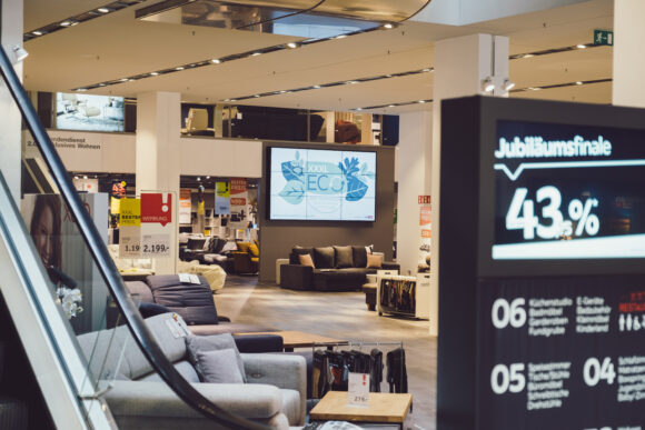 Die XXXLutz Möbelhäuser modernisieren in über 60 Standorten mit jeweils bis zu 100 Sichtstellen die Kundenkommunikation über Bildschirme und interaktive Produktkonfiguratoren. Dafür setzt das Unternehmen in den Möbelhäusern der Marken XXXLutz, Möbelix und Mömax auf die Digital Signage Software kompas von dimedis.