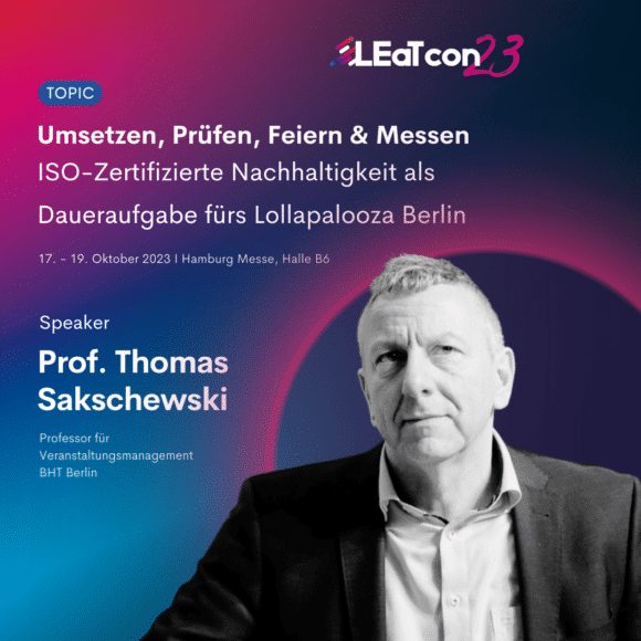 Prof. Thomas Sakschweski wird auf der LEaT con im Oktober in Hamburg zusammen mit der Nachhaltigkeitskoordinatorin Hanna Mauksch und mit Jana Posth (Produktionsleitung Lollapalooza) einen Talk über die Forschungsergebnisse der Studien führen. Der 30-minütige Talk findet am 18. Oktober ab 16:00 Uhr in der Messe Hamburg statt.