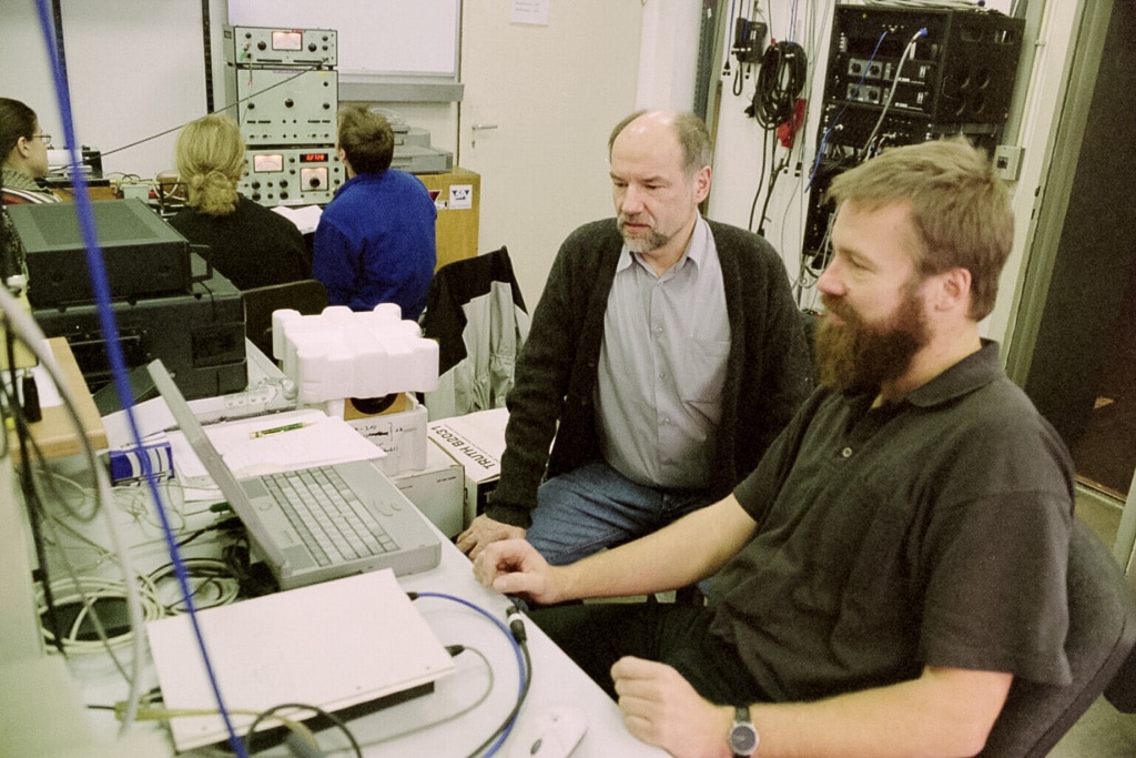 Günther Nubert und Anselm Goertz beim kreativen Austausch über die Testmethoden von Production Partner und Sound&Recording (2003) (Bild: Detlef Hoepfner)