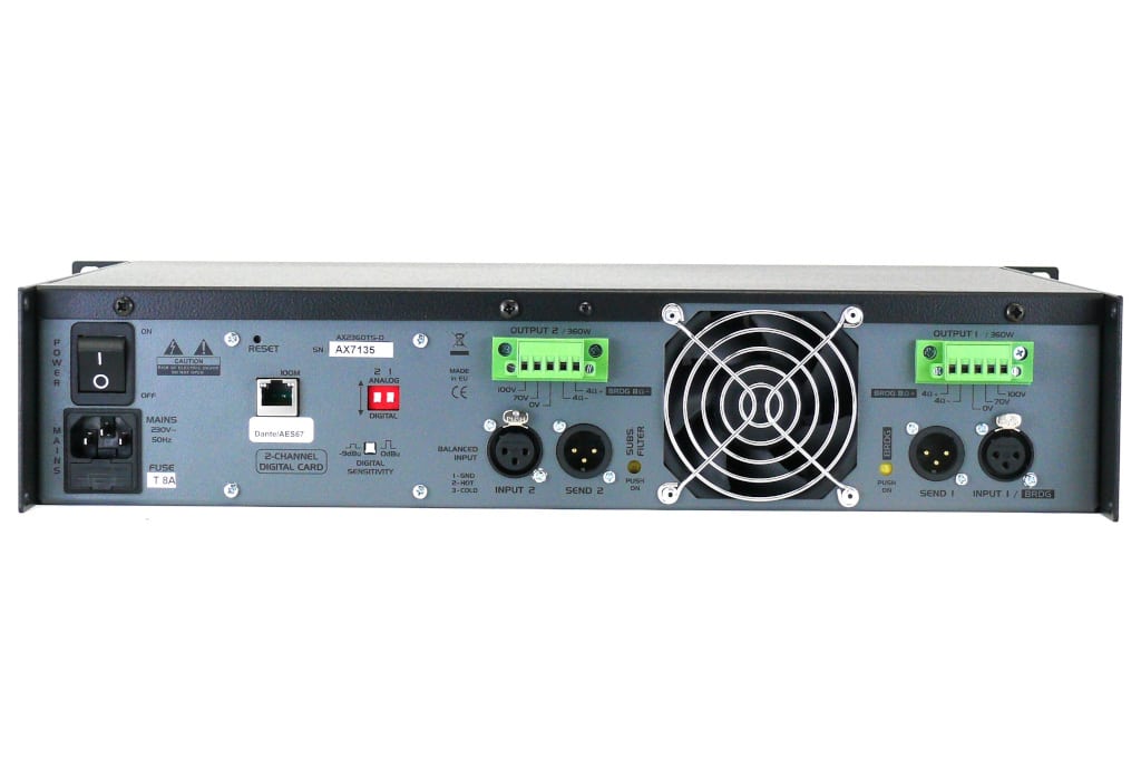 Die Firma axxent stellt eine Serie von Zweikanalverstärkern mit Dante/AES67-Eingängen vor: drei Modelle in den Leistungsstufen 120W, 240W und 360W sind unter den Typenbezeichnungen AX2120TS-D, AX2240TS-D und AX2360TS-D verfügbar.