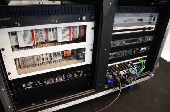 Das SPS-System des Adunas Inspizientensystems besteht aus industriellen Komponenten des Herstellers Beckhoff. Diese sowie eine moderne Netzwerkarchitektur wurde am Beispiel eines Technik-Racks demonstriert mit Produkten von BroaMan, Odin von RTS Intercoms und Yamaha. (Bild: Amptown System Company )