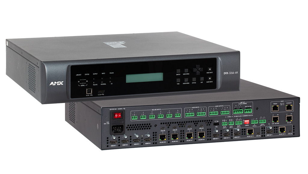 AMX präsentiert die Erweiterung seiner Präsentations-Kreuzschienen Serie Enova DVX mit 4K60 und 4:4:4. Die beiden neuen Modelle DVX-3266-4K (8×4+2) und DVX-2265-4K (6×2+1) bieten auf 2 HE laut Hersteller überragende Bildqualität, einen 120 Watt Crown Verstärker, BSS Audio-Signalverarbeitung und dbx Feedback-Unterdrückung.