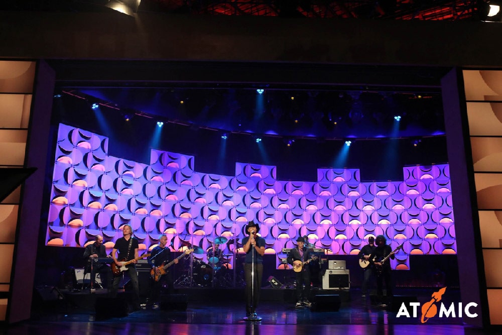 Als Hintergrund für Bühnen- und Veranstaltungsräumlichkeiten basieren 22 verschiedene Panel-Motive auf einer modularen Bauweise . (Bild: Atomic )