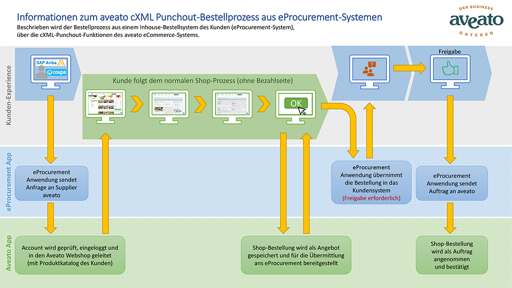 Eine Catering-Bestellung aus einem Inhouse-Bestellsystem des Kunden (E-Procurement-System) über die cXML-Punchout-Funktionen des aveato eCommerce-Systems funktioniert wie in der Grafik dargestellt.
