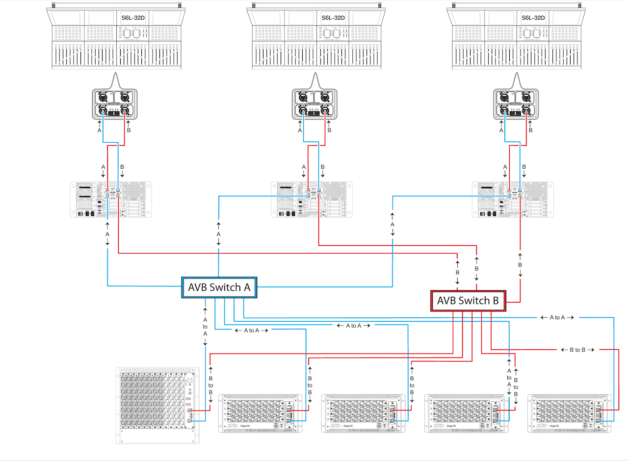 I/O-Sharing und Gain-Sharing auf drei Systemen: Bislang konnten VENUE-Anwender zwei S6L-Systeme miteinander verbinden und die Eingänge und Ausgänge von Stage Racks auf beiden Systeme nutzen. Mit VENUE 7 können sich bis zu drei Systeme die selben Stage Racks teilen. Auf diese Weise können sowohl das FOH- und Monitor- als auch ein Broadcast-Pult auf dieselben Ein- und Ausgänge zugreifen, ohne auf zusätzliche analoge Splitter angewiesen zu sein. Die Kompensation der Vorverstärkung über alle drei Systeme hinweg erfolgt automatisch durch die Avid True Gain-Technologie. Sobald die Systeme in einer redundanten AVB-Sternkonfiguration verbunden sind, erkennen sich die einzelnen Systeme automatisch und aktivieren die entsprechende Gain-Kompensation.