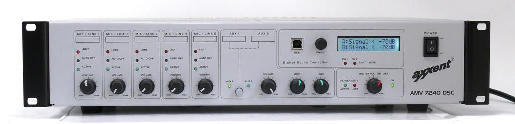 axxent präsentiert eine Weiterentwicklung des Mischverstärkers AMV7240 MKII in analoger Technik als neues Modell AMV7240DSC mit zweikanaligem DSP.