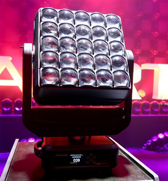 Das neue Magicpanel-FX aus dem Hause Ayrton sieht erst mal nicht viel anders aus als das bereits bekannte Magicpanel-R. Der große Unterschied zum Vorgängermodell ist jedoch, dass das Gerät jetzt auch mit einer Zoomoptik ausgestattet wurde, die einen Zoombereich von ca. 4° – 50° ermöglicht. Auch wurden die 25 einzelnen LED-Chips, die bei dem neuen Modell als High-Power-LEDs ausgeführt worden sind, bei dieser neuen Produktvariante hinter Wabenförmigen Linsen angeordnet. Der Lichtstrom wird beim Magicpanel-FX mit ca. 18.000lm angegeben. Das Gerät kann sowohl über DMX512, als auch über ArtNet oder sACN angesteuert werden. Hierfür sind je nach Betriebsmodus bis zu 118 DMX-Kanäle pro Gerät notwendig.