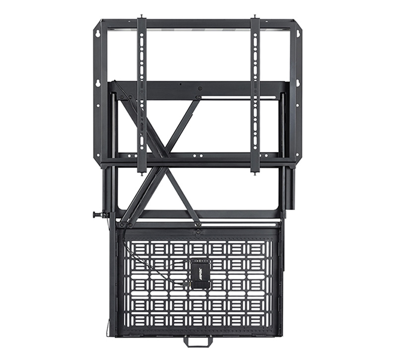 Die BT7885 ist eine Bildschirmmontagelösung mit einer integrierten ausziehbaren „Pull-Down“-Schublade zur Aufbewahrung von AV-Geräten hinter dem Bildschirm.
