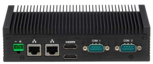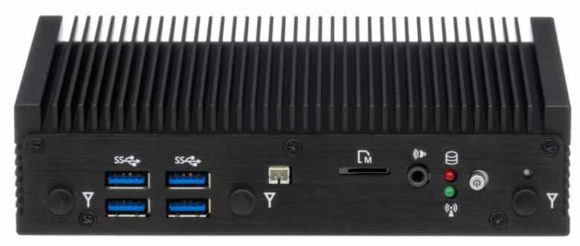 Der BOX E3940 bietet diverse Anschlüsse auf sehr kleinem Raum. Auf dem Frontpanel befinden sich neben sagenhaften 4 USB 3.0-Ports ein Audio Line-Out, sowie zwei Antennen-Anschlüsse. Des Weiteren bietet der BOX auf der Vorderseite einen Power Button und einen SD-Kartenslot. Die Rückseite des sehr kompakten Mini-PCs ist mit zwei LAN-Schnittstellen und zwei HDMI-Ports ausgestattet und verfügt außerdem über zwei COM-Schnittstellen, welche das System auch für den industriellen Bereich tauglich machen.