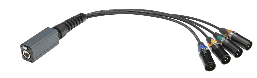 Das Kernelement der SYSCAT4-Familie ist ein Spleiß-Adapter. Er besteht aus dem kompakten und robusten Metallgehäuse HI-HOUSING, das eine integrierter EtherCON-RJ45-Vollmetall-Einbaubuchse sowie eine stabile Leitungsverschraubung enthält. Der Adapter ist mit einem 50 cm langen 4-fach Spleiß aus der flexiblen und widerstandsfähigen digitalen Patchleitung SC-SEMICOLON 2 kombiniert und mit NEUTRIK oder HICON XLR-Steckverbindern ausgestattet. Die Kanalzahlen sind in SOMMER-Manier deutlich leserlich an den Steckverbindern angebracht.