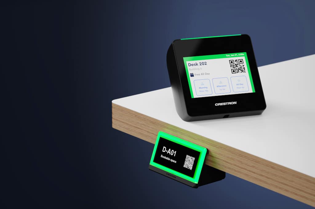 Crestron Desk Scheduling-Lösungen sollen einen Übergang zu mobilen Hot-Desk-Bereichen und Büros bieten, indem sie es den Mitarbeitenden ermöglichen, einen Ort für ihre Zeit vor Ort zu planen, bevor sie das Haus verlassen, direkt von der Buchungssoftware auf ihrem Laptop. Für die Mitarbeiter:innen in den Büros zeigen LED-Statusanzeigen an, welche Arbeitsplätze verfügbar sind, so dass sie einen Platz auf dem Touchscreen oder durch einen QR-Code-Scan reservieren können.