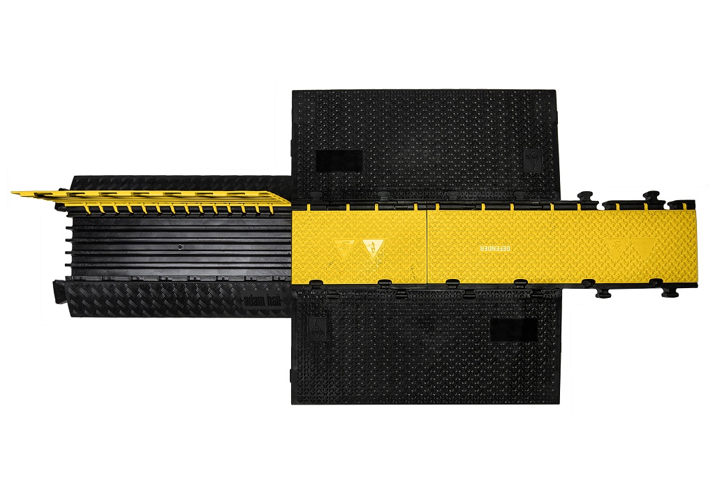 Jedes MIDI 5 2D Mittelteil lässt sich mit der komplett überfahrbaren und barrierefreien Rampe kombinieren. Mit einer Steigung von 6° entspricht das Rampen-Modul dabei nahezu allen Auflagen und Standards für Barrierefreiheit auf Veranstaltungen. Durch die flache Steigung erleichtert die MIDI 5 2D Serie unter anderem Rollstuhlfahrern die mühelose Überquerung und ist gleichzeitig stabil genug, um das hohe Gewicht von Staplern und LKWs aufzunehmen. Ebenso verfügt die MIDI 5 2D Serie über die Defender LaserGrip-Oberfläche, die mit ihrer ergonomischen Formgebung und Oberflächenstruktur das Risiko minimiert, eine ganze Kabelbrücken-Linie versehentlich zu verschieben.