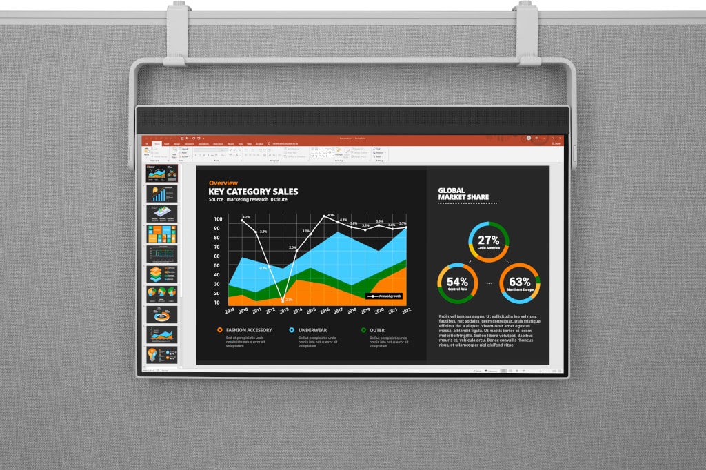 Der 27″ große Libero Monitor 27BQ70QC im Fabric Design, den LG auf den Markt bringt, kann auf zwei verschiedene Weisen in die Arbeitsumgebung integriert werden. Zum einen lässt sich der Monitor auf dem Schreibtisch aufstellen, zum anderen kann er – um 180° gedreht – am bügelförmigen Standfuß aufgehängt werden. Durch die im Lieferumfang inbegriffenen Haltebügel findet der Libero Halt an Trennwänden und Raumteilern. Aufgrund der Bügelform eignet sich der Standfuß auch als Tragegriff.