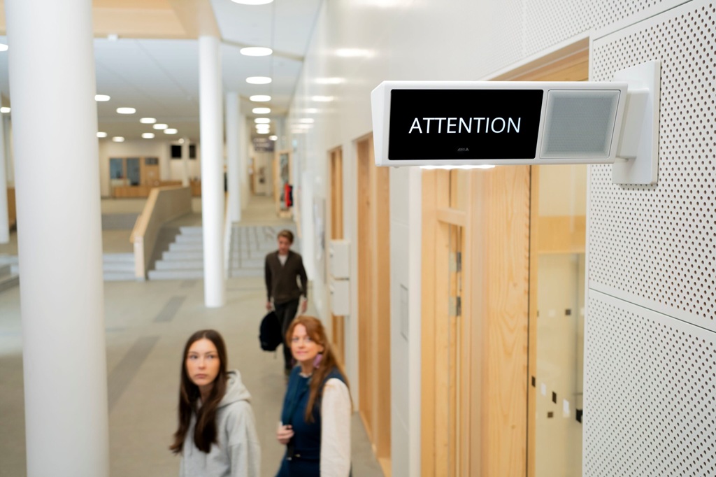 Der Display-Lautsprecher AXIS C1720 sorgt für klare visuelle und akustische Warnmeldungen und stellt sicher, dass wichtige Informationen Mitarbeiter und Schüler sofort erreichen (Bild: Axis Communications)