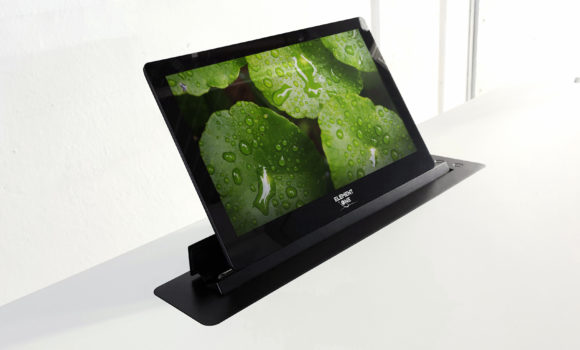 Der senkrecht ein- und ausfahrbare, 8 mm dünne Monitor des Convers Blade 156 kann einfach in bereits vorhandenes Mobiliar integriert werden: mit seinem geringen Tischausschnitt in jegliche Tischgröße – oder eben auch in einen Stehpult.