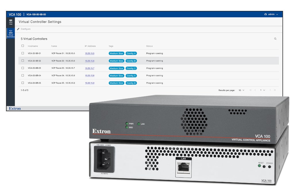 Extron gibt die sofortige Verfügbarkeit der VCA 100 Virtual Control Appliance mit integrierten virtuellen Steuerungsprozessoren bekannt. Dieses virtuelle Steuerungssystem unterstützt Unternehmen bei der Bereitstellung, Skalierung und Verwaltung ihrer AV-Systeme, indem es die Möglichkeit bietet, AV-Steuerungsressourcen an einem zentralen Ort neben den Ressourcen, die das IT-Team des Unternehmens bereits verwaltet, zu hosten.