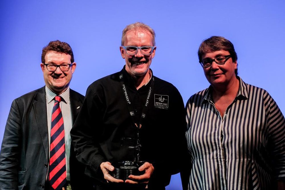 Der ABTT zeichnete die Impression X4 Bars von GLP aus: Robin Townley (ABTT), Mark Ravenhill (GLP) and Louise Jeffreys (ABTT) bei der Preisübergabe (v.l.n.r.) (Bild: GLP)