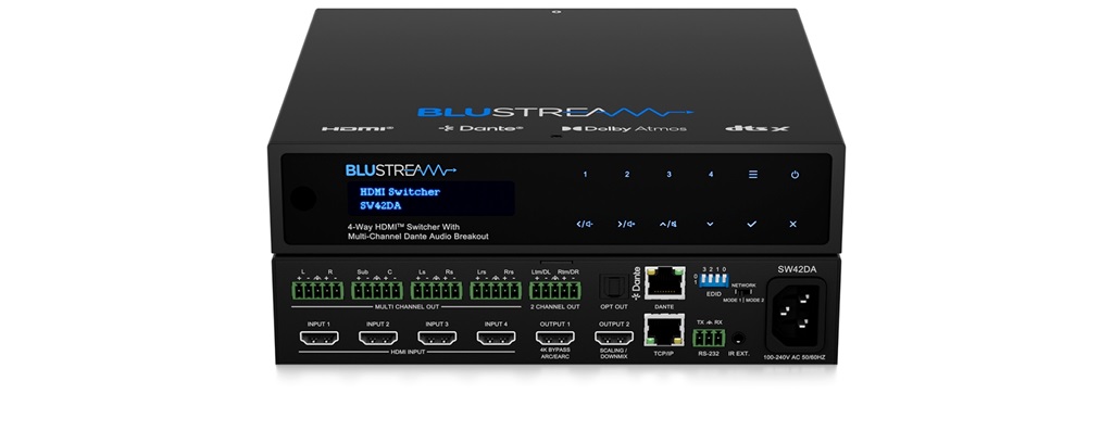 Der Blustream SW42DA ermöglicht es, eingebettetes HDMI-Audio, etwa Dolby Atmos oder DTS-HD, zu extrahieren und sowohl über zehn analoge Ausgänge als auch über zehn Dante-Kanäle auszugeben. Zusätzlich steht ein digitaler S/PDIF-Ausgang zur Verfügung.