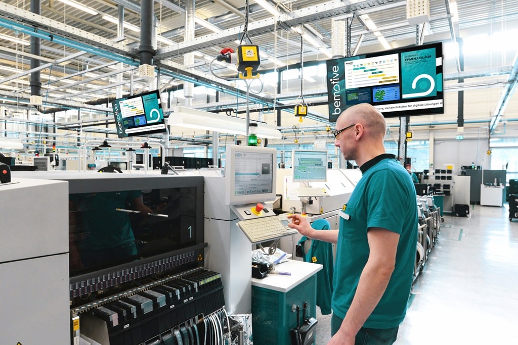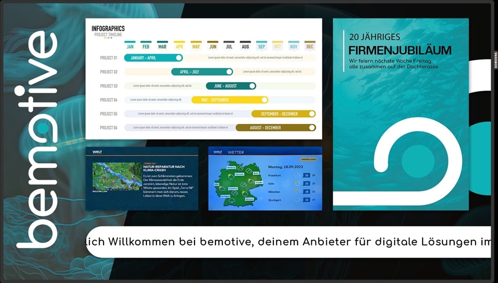 Dank dieser Flexibilität sind den Einsatzbereichen der Display-Lösung quasi keine Grenzen gesetzt – von der Mitarbeiterkommunikation – etwa zur Anzeige von Schichtplänen, Kennzahlen sowie aktuellen Unternehmensnews und Terminen über die Raumbuchung und Wegweisung bis hin zu Infotainment oder Werbeflächen. Sie machen in der Fertigungshalle eine ebenso gute Figur wie im Büro, im Meeting- und Aufenthaltsraum, auf dem Büroflur oder am Empfang.
