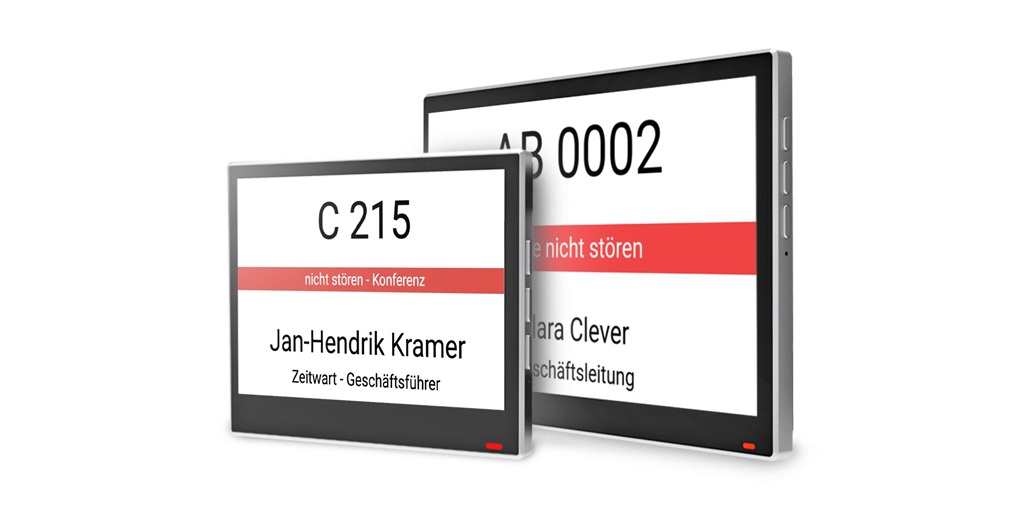 Die Doorzigns informieren mit drei Farben – schwarz, weiß und rot – über die Raumbelegung. Drei seitliche Buttons lassen sich frei belegen, etwa um bei einem spontanen Meeting per Knopfdruck auf „belegt“ zu stellen oder verschiedene Arzt-Namen am Behandlungszimmer aufzurufen. Die Buttons lassen sich auch deaktivieren, wenn die Displays zum Bespiel in öffentlichen Gängen eingesetzt sind.