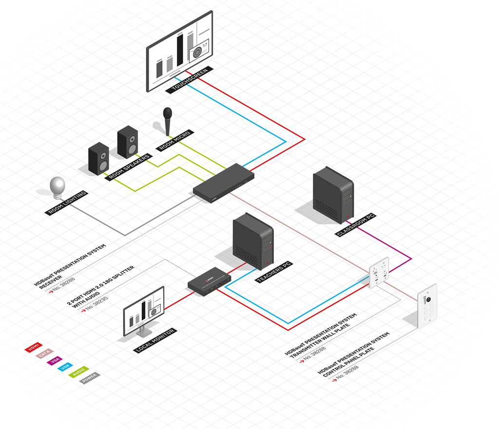 Beim HDBaseT Presentation System von Lindy handelt es sich um ein multifunktionales 4K-Präsentations-System für Schulungsräume. Es besteht aus den folgenden drei Komponenten, die per serieller RS232-Schnittstelle miteinander kommunizieren: Ein Anschlussfeld, ein Schalt-Tableau (beides für die Wand- oder Tischmontage geeignet) sowie eine Stand-Alone-Receiver-Einheit. Letztere bildet die Kern-Komponente.