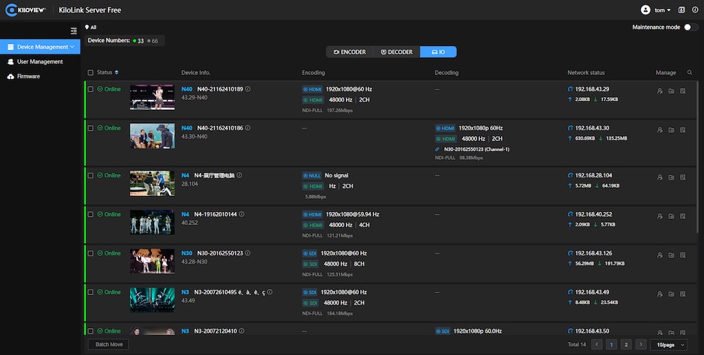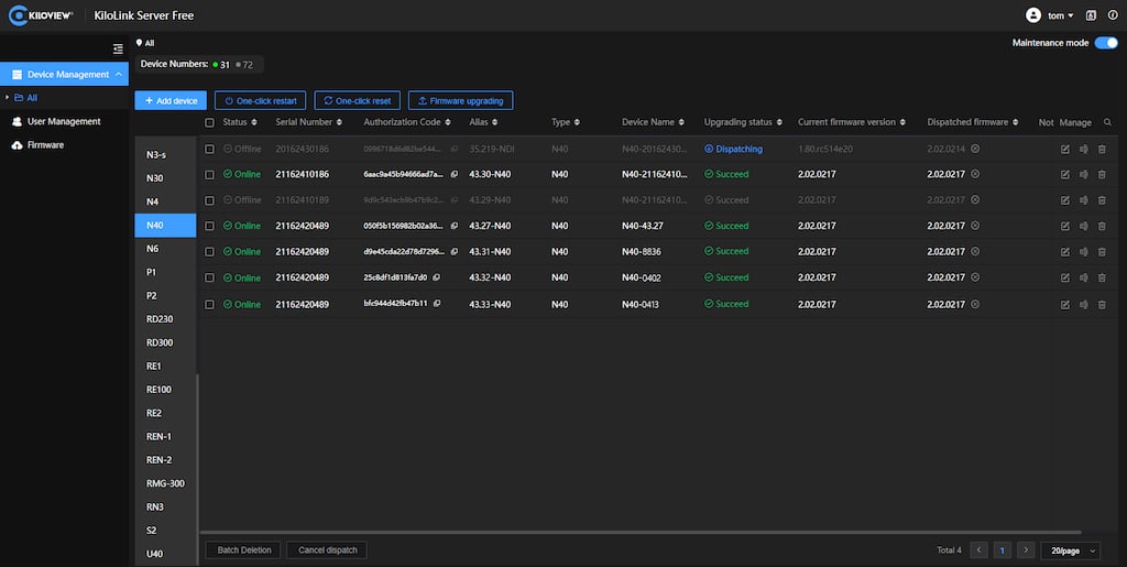 Für Benutzer, die mehrere von Kiloview-Geräte verwalten, soll der Server Free das Hin- und Herspringen zwischen mehreren Benutzeroberflächen ersparen, indem er ein einziges intuitives Dashboard für alle Geräte implementiert. Die Kunden können die Firmware aktualisieren, die Werkseinstellungen wiederherstellen oder die Geräte neu starten.
