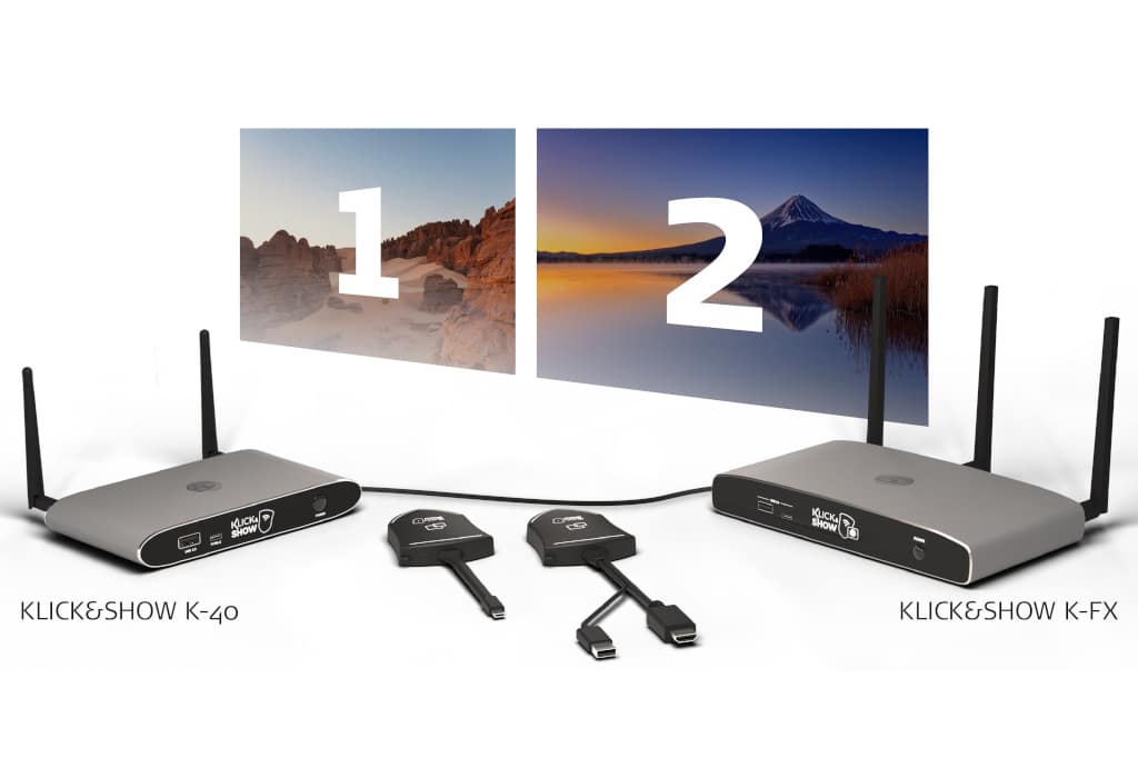 Eine neue Funktion des Firmware-Updates ist die Klick&Show Screen-Link-Funktion. Diese ermöglicht es, zwei Klick&Show-Basiseinheiten miteinander zu verknüpfen. Somit stehen doppelt so viele HDMI-Ausgänge sowie Prozessorleistung zur Verfügung und Inhalte können gleichzeitig auf zwei Anzeigen ausgegeben werden. Letzteres sei vor allem für Anwendungen geeignet, die von der Ausgabe verschiedener Bildinhalte über zwei Hauptdisplays profitieren. So ließen sich beispielsweise bei Präsentationen verschiedene Wertetabellen abgleichen sowie in Webkonferenzen gleichzeitig alle Teilnehmenden und Inhalte anzeigen. Im Bildungsbereich bestehe wiederum die Möglichkeit, dass das Schulungsmaterial des/der Dozierenden permanent abgebildet wird, während die Inhalte der Schüler:innen auf der zweiten Anzeige durchgewechselt werden.