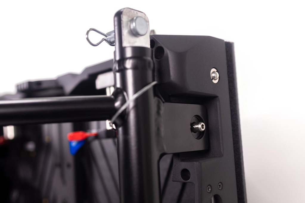Ledtek möchte vor allem die Sicherheit der neuen Pro-Serie hervorheben. Denn durch den Tri-Frame, bei dem es sich um eine Dreipunkttraverse handelt, soll der bisherige Aufbau durch ein einfaches, aber stabiles Klicksystem optimiert werden. Das ermögliche Konstruktionen von bis zu 12 m Spannweite, die nur zweimal horizontal abgefangen werden müssen. Modulrahmen und Tri-Frame werden durch dieses Klicksystem verbunden und dann mit Bolzen befestigt. Herkömmliche Verschraubungen und Verrohrungen würden überflüssig, sodass der Tri-Frame für einen simplen Aufbau sorge, der deutlich weniger Zeit und Arbeitsaufwand erfordert.
