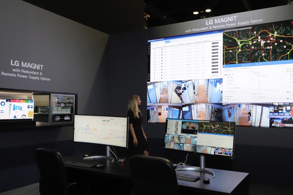 Den Unternehmensbereich zierte ein 163“ LG Magnit mit optionaler unterbrechnungsfreier Stromversorgung. In der Zone befanden sich auch das 21:9-LED-All-in-One-Display des Unternehmens, das für Breitbild-Videokonferenzplattformen optimiert sei, sowie andere Displaylösungen.