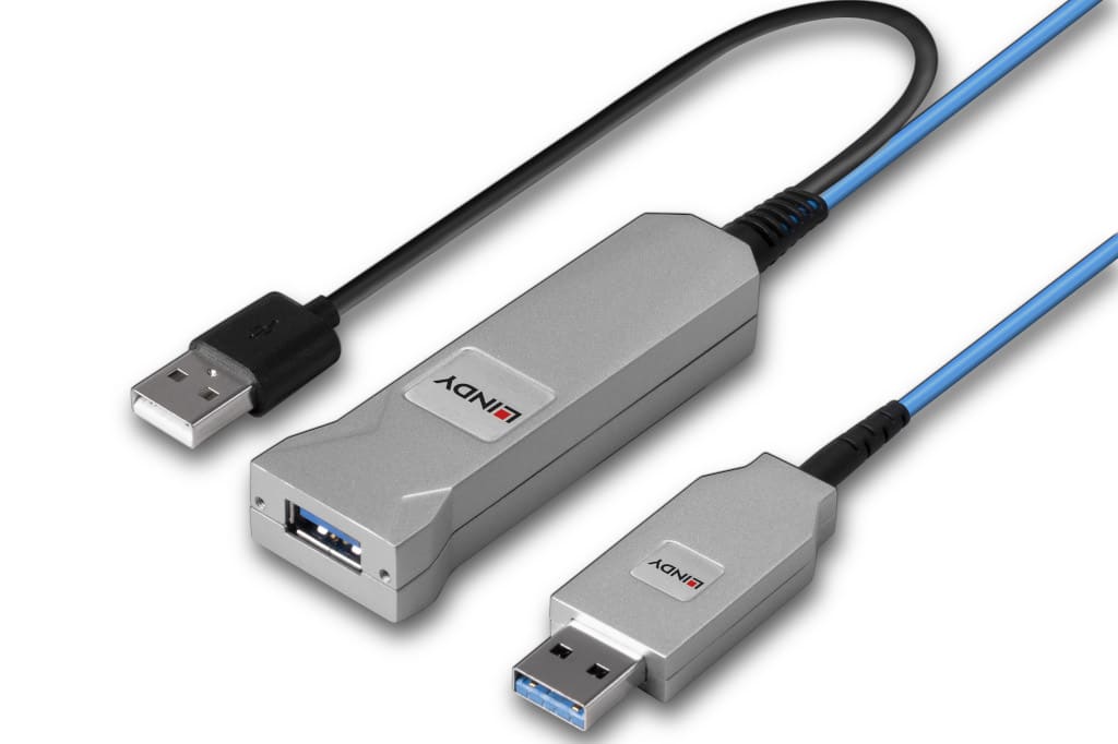 Mit den neuen ‘Fibre Optic USB 3.0 Kabeln’ von Lindy ist es nun möglich, Datenraten von USB 3.0 auf größere Entfernungen als 5m stabil zu übertragen – je nach Ausführung der Glasfaser-Verlängerung kann die Entfernung bis zu 30m, mit der größeren Lösung über 100m und über eine zweimalige Kaskadierung auch über 300m betragen.