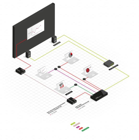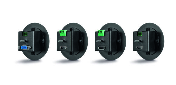 Der Switch wird mit vier Anschlussfeldern geliefert, welche direkt in die Tischplatte eines Konferenztisches eingelassen werden können. Diese vier Einbau-Felder bieten zwei HDMI-Eingänge, einen DisplayPort- und einen VGA-Eingang, an denen eine Vielzahl unterschiedlicher Quellgeräte angeschlossen und einzeln per Tastenanwahl ausgegeben und geschaltet werden können. Der Presentation Switch bietet somit effiziente Steuerungsmöglichkeiten in kollaborativen Arbeitsumgebungen oder in Konferenz-Räumen.