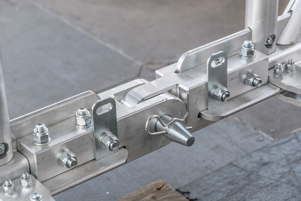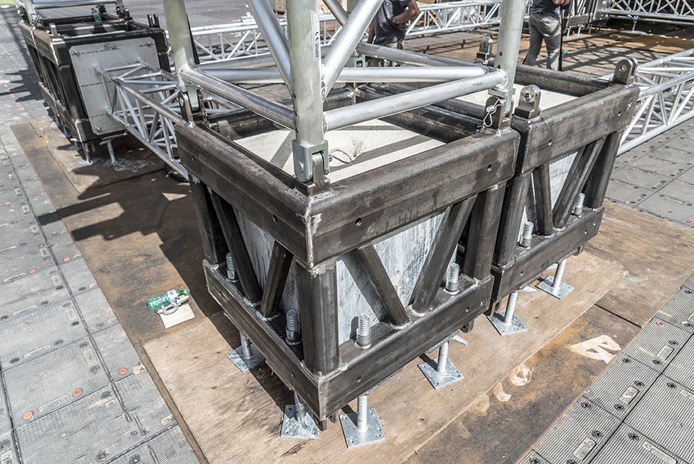 Die S355 Stahl-Bauweise trägt zur unverwechselbaren, modularen und eigenständigen Umgebung des MyT Folding Steroid-Systems bei. Die multi-direktionalen Sleeveblöcke verfügen über eine vollmechanische Verriegelung, die, in Verbindung mit Sicherheitsblöcken, vor Herabfallen und unbeabsichtigtem Heben schützt. Das vollmechanische Verriegelungssystem des Sicherheitsblocks umfasst ein Teleskoprohr sowie einen leicht zugänglichen Hebel-Mechanismus. Die vollintegrierte Towerbase-Stützkonstruktion hat ein modulares Stahlballastsystem mit Verbindungen auf allen sechs Seiten.