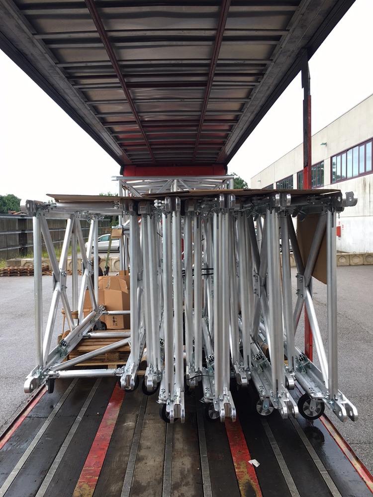 Gennaro Chinelli: Da sie aus der speziellen 7003 T6 Aluminium-Legierung gefertigt sind, haben sie eine sehr hohe Tragfähigkeit. Das MyT Folding Steroid-System ermöglicht auch einen sehr schnellen Aufbau, wobei hohe Sicherheitsanforderungen gewährleistet sind. Und schließlich sind diese Traversen faltbar, was einfachere Lagerung und somit reduzierte Transportkosten bedeutet.