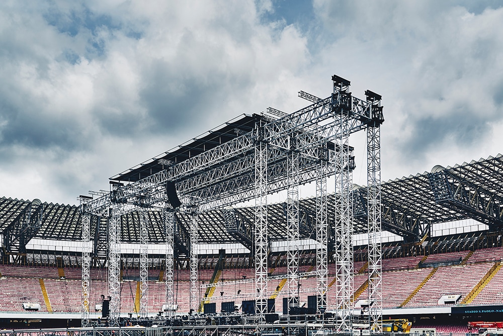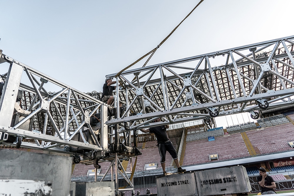 Das erfolgreiche Debüt des MyT Steroid Folding-Dachsystems spielte sich im San Paolo-Stadion im italienischen Neapel ab, wo es einerseits als Testaufbau und andererseits als riesige Dachkonstruktion für ein wichtiges Live-Konzert diente. Das maßgefertigte 30 x 15 m MyT Folding Steroid-Dachsystem wurde fachmännisch von Massimo Stage errichtet, einer Topfirma in Europa für Event-Veranstaltung und Bühnenverleih, die auf große Veranstaltungen spezialisiert ist.