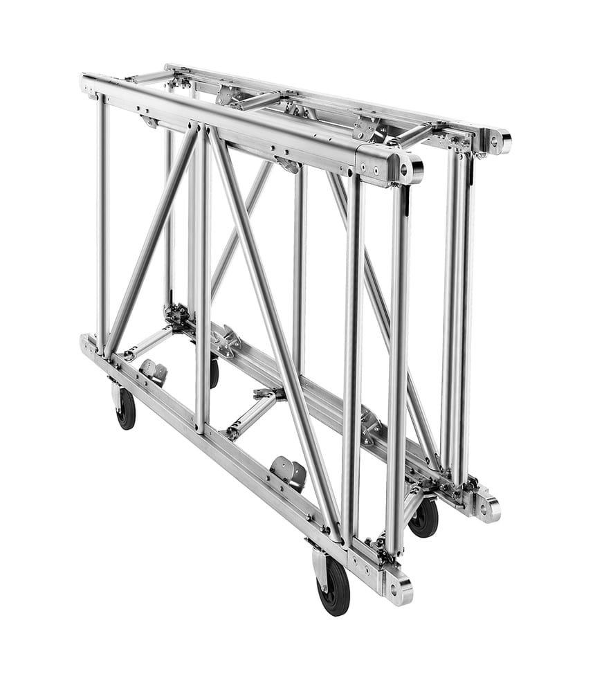 Eine bahnbrechende Eigenschaft des MyT Folding Steroid-Dachsystems ist sein Klapp-Design, das es einer einzigen Person ermöglicht, einen 3-Meter-Abschnitt in weniger als 3 Minuten selber zusammenzufalten und zu verstauen. Diese tolle Falt-Funktion, mit der die Breite von Traversenabschnitten um 63 % reduziert wird (von 84 cm auf 31 cm), spart Lagervolumen und Transportkosten.