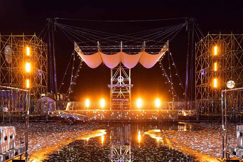 Erstmals im Rampenlicht stand das neue Mitglied der Megaforce Bühnenfamilie auf dem „Fest“ in Karlsruhe. Die gelungene Verbindung von Funktionalität und Installation soll das Publikum beim „badischen Woodstöckle“ am Modellbootsee begeistert und es mit auf eine Reise in die Musikgeschichte genommen haben – 50 Jahre nach dem legendären Rock-Festival in den USA. Eine Reise, die sich wiederholen lässt … Um die Musikgeschichte erzählende Towerbühne aufzubauen, benötige ein sechsköpfiges Team eineinhalb Tage, für den Abbau nur einen Tag. Der Transport erfolgt mit zwei Sattelzügen.