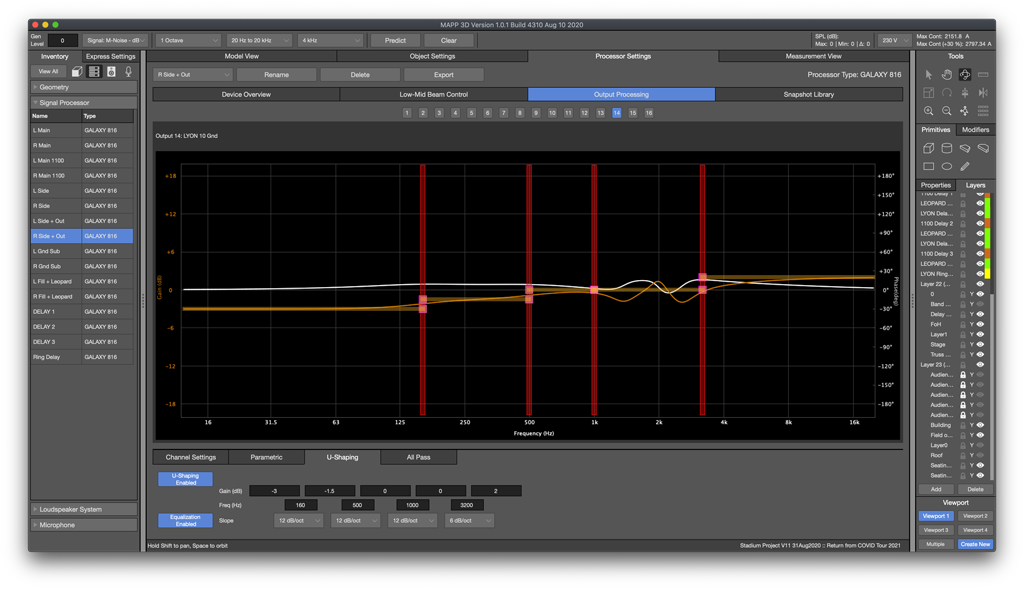 Darüber hinaus können Systemdesigner mit MAPP 3D in der Planungsphase eine virtuelle Systemoptimierung durchführen. MAPP 3D enthält virtuelle Galaxy Signalprozessoren, die von den Designern hinzugefügt und konfiguriert werden können. Die entsprechenden Simulationsergebnisse werden angezeigt, die gewählten Einstellungen können später direkt mit den Hardware Prozessoren vor Ort synchronisiert werden. Alle Output Processing-Funktionen der Galaxy Modelle stehen zur Verfügung, die Copy- und Paste-Funktion kann verwendet werden, um Einstellungen in weitere Prozessorkanäle zu übertragen.