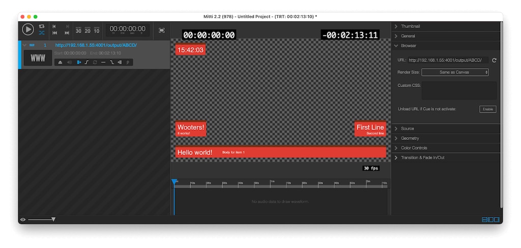 Mit dem neuen Browser Source Cue-Typ in v2.2 kann Mitti Webseiten mit einem transparenten Hintergrund rendern. Diese Option wurde vor allem entwickelt, um das Rendern webbasierter Anwendungen für Logos und Bauchbinden wie H2R Graphics, Holographics oder SPX Graphics in Mitti zu vereinfachen, die dann über HDMI, SDI oder NDI an Switcher ausgegeben werden. Mit Blackmagic Design Karten ist die Aufteilung in Key und Fill möglich.