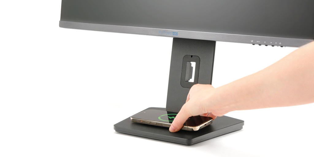 Der FutureAIO bringt eine Reihe smarter Features mit, wie die Ladeschale am Monitorfuß, die das Smartphone kabellos mit Strom versorgt (Bild: Concept International)
