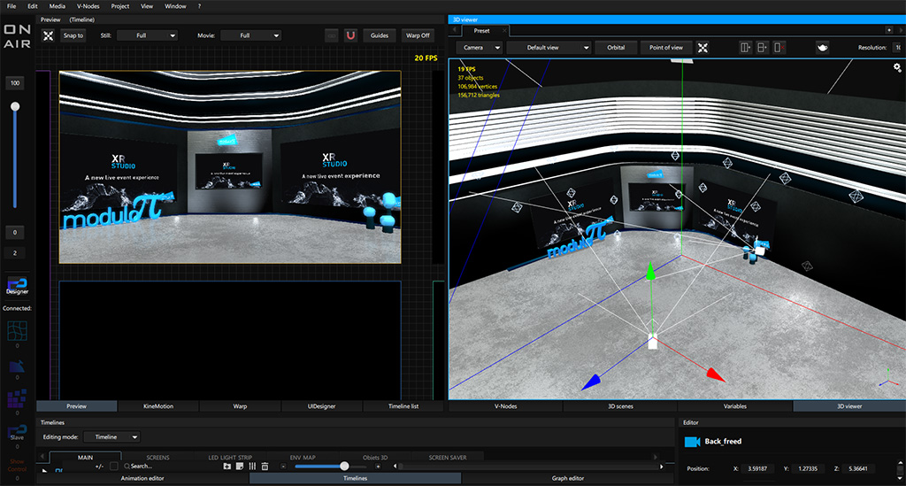 Mit Modulo Kinetic erstellte virtuelle Events sind kompatibel mit LED-Bildschirmkonfigurationen, aber auch mit Green-Screen-Setups für Projekte mit kleinem Budget. Im Gegensatz zu anderen auf dem Markt erhältlichen Lösungen soll die Modulo Kinetic-Plattform alle erforderlichen Tools zur Erstellung virtueller Echtzeitsets enthalten: Pre-Visualisierungstools für real-time 3D-Studies, Simulation und VR, eine 3D-Umgebung and benutzerfreundliche 3D-Engine für Echtzeitgenerierten Content, ein verbesserter Chroma Keyer, leistungsstarke 2D-Echtzeit-Compositing-Tools, ein Timeline-Sequenzer sowie ein Nodal Editor zum einfachen Hinzufügen von Interaktivitätsmodulen für die Show.