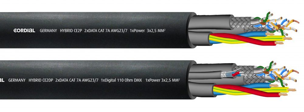 Der deutsche Kabelhersteller Cordial präsentiert seine beiden neuen Data/Power Hybridkabel. Gepaart mit einer leistungsfähigen 2,5 mm² Stromleitung werden beim Cordial CE 2 P zwei Stränge des auf hohe Reichweiten ausgelegten Cordial CCAT 7A Long-Run zu einem Langstrecken-Hybridkabel komponiert. Gleiches gilt für das Cordial CE 2 DP, hier kommt zusätzlich noch eine 2x 0,22 mm² DMX / AES/EBU-Leitung mit präzisem 110 Ohm Wellenwiderstand hinzu.