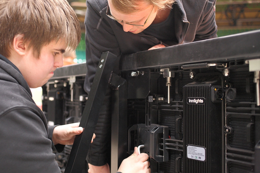 Marius Kuschmierz, technischer Leiter bei Innlights, erklärt dazu: „Die von uns entwickelte Lösung erlaubt den Einsatz unserer führenden Event-Vermietprodukte, wie zum Beispiel InnScreen R5, InnScreen M5, InnScreen C2 und C3 als LED-Banden-Technik”. So ist InnScreen M5 robust konzipiert für Display- und Floor-Anwendungen im Innen- und Außenbereich. Die beiden InnScreen-Produkte der C-Serie bieten mit ihren kleinen Pixel-Abständen hohe Auflösungen, die gerade bei typischen Betrachtungsabständen in Hallen von großem Vorteil sind. Unter Verwendung der InnScreen R5-Module erfolgt der Aufbau sogar besonders schnell, wegen der Panel-Größe mit 50 cm Breite bei 100 cm Höhe.