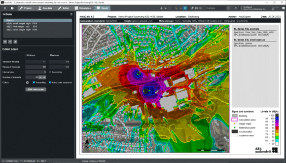 NoizCalc 4.0 wurde in Zusammenarbeit mit SoundPLAN, einem spezialisierten Softwareentwickler für die Simulation von Umgebungslärm entwickelt. Die Systemeinstellungen werden direkt aus d&b ArrayCalc importiert. Die Software bietet dem Benutzer eine Auswahl an internationalen Normen für die Berechnungen, abhängig von den Anforderungen des Benutzers (CNOSSOS-EU, ISO 9613-2 und Nord2000).
